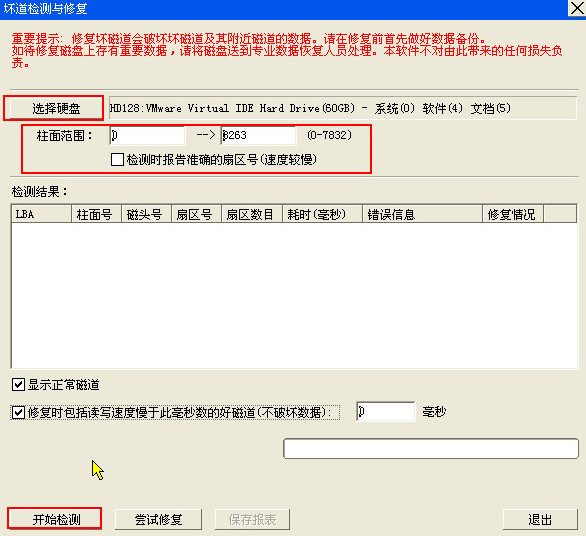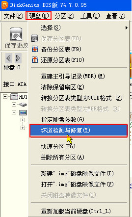 5、再打开diskgenius工具,点击“硬盘-坏道检测与修复”,在坏道检测与修复窗口中,点击“选择硬盘”按钮选择需要进行检测的硬盘,然后设定柱面范围,其它不做更改,点击“开始检测”按钮。
