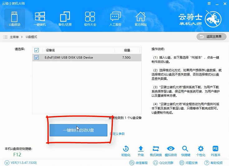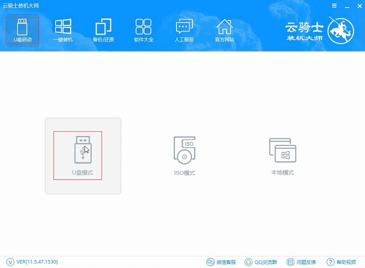 1、将下载的云骑士装机大师,双击打开,然后点击选择【U盘模式】。