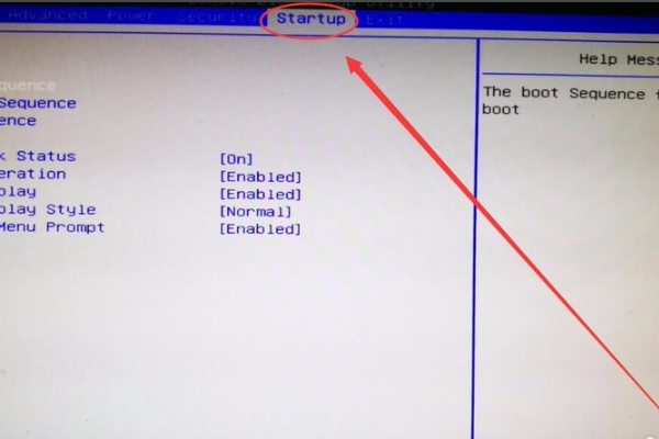 2、进入CMOS界面后,用键盘上的左右键选择Startup选项。