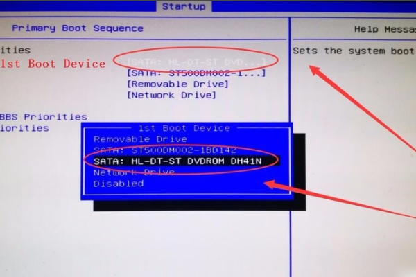 4、选中第一项1st Boot后的选项,按下回车键,出现的界面中选择自己电脑的光驱型号,有DVDROM字样的一般是光驱。
