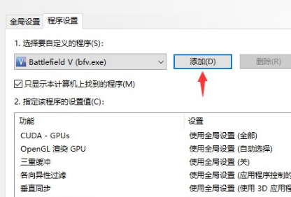 6、选择3D设置——管理3D设置——点击程序设置,选择添加,添加战地5;