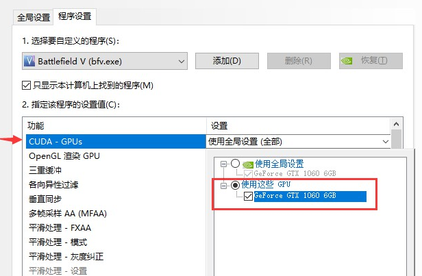 7、选择CUDA-GPUs,从全局设置修改为独显,点击确定保存,重启游戏即可!