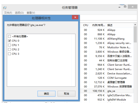 2.在“进程”选项卡中找到“gta_sa.exe”右击该进程,选择“关系设置”只保留CPU0,把其他的CPU都勾掉确定