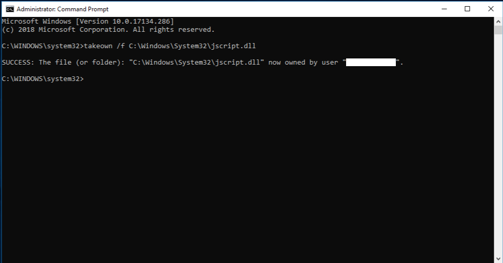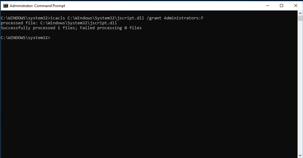 注意:Path_And_File_Name 占位符代表损坏文件的路径和文件名。 例如,键入 takeown /f C:windowssystem32jscript.dll。