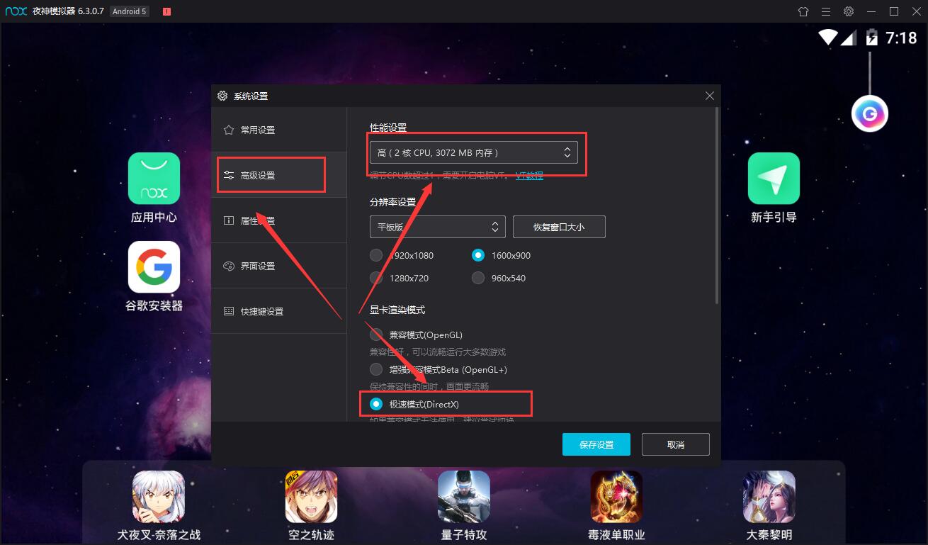 2、切换到【高级设置】,把【性能设置】改为【高】,把显卡渲染模式改为【极速模式】。