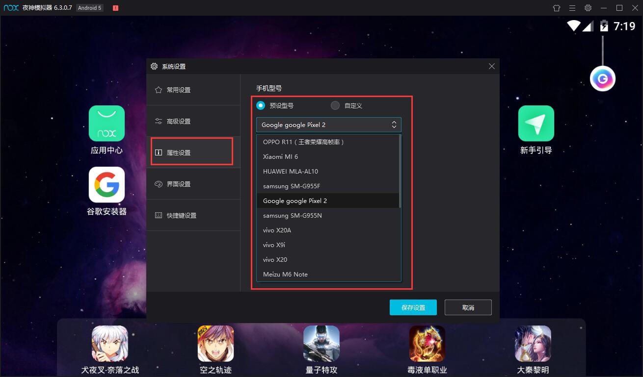 3、切换到【属性设置】,在预设型号中,选择自己想要的手机型号。
