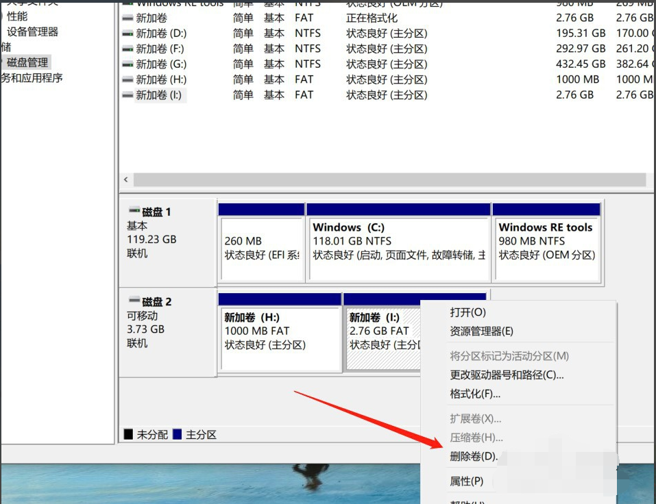 4、选中U盘之后,在下面可以看到U盘的所有分区,将U盘的所有分区都右键点击,选择“删除卷”。