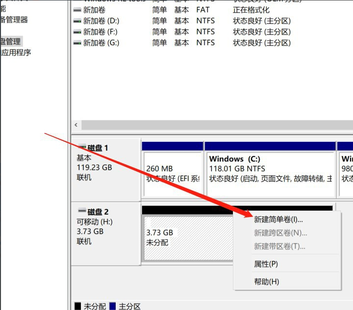 5、全部分区删除之后,再次右键没有分区的U盘,点击“新建简单卷”。