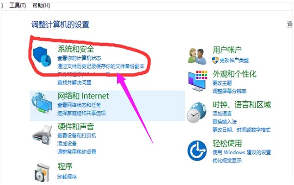2.在控制面板中选择“系统和安全”,进入下一步。