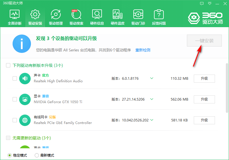 3、接着点击上方的驱动安装,它会自动扫描,最后点击一键安装就可以了。