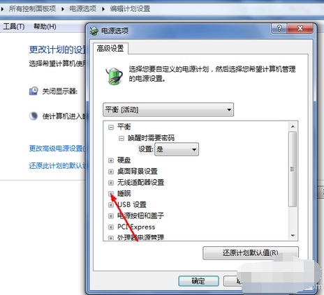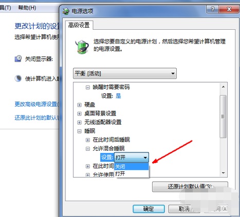 5、在睡眠选项下,找到允许混合睡眠的设置,在下面的设置中,如果你的系统是开启了休眠的,那么默认就是关闭的,我们要想关闭休眠,就得把混合睡眠打开,我们点击三角符号,将关闭改为打开