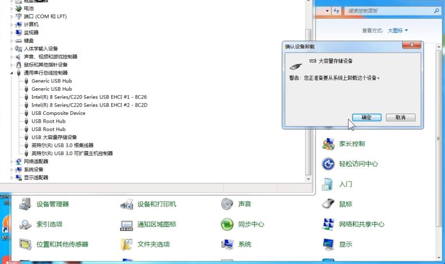 找到USB大容量存储设备,选中点击“右键”找到卸载后把U盘拔出,再把U盘插上查看是否已经正常识别。