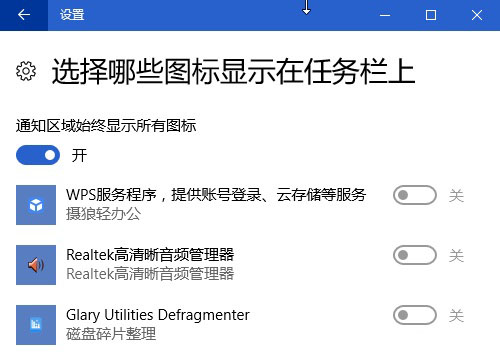 许多软件都被藏在系统托盘的折叠菜单中,这样就需要点开菜单再找软件,有时还会错过软件提示消息。如果让托盘自动处于展开状态,一眼便可以看到并选择需要的软件图标。为此,只需在任务栏设置窗口中,点击“选择哪些图标显示在任务栏上”链接,然后将“通知区域始终显示所有图标”开关打开即可(图6)。