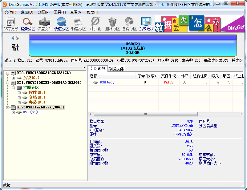 2、下载 DiskGenius 分区工具,插上 U 盘后并打开软件,在软件左侧中检查是否有识别到 U 盘,或者出现 U 盘未分区的状态,我们可以快速对 U 盘进行检测。如果 U 盘有显示,我们就选择快速分区,对 U 盘使用分区后检查在电脑中能否正常显示。