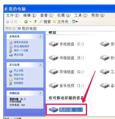 先插上U盘,进入“我的电脑”,找到自已的U盘图标,然后记下自已的U盘盘符,