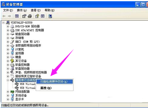 然后右键点击“通用串行总线控制器”项目,在弹出的下拉菜单中选择“扫描检查硬件改动”。