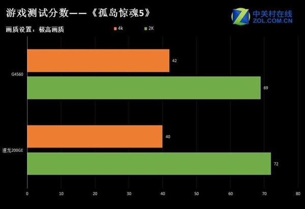 在《孤岛惊魂5》这种野外环境丰富的游戏中我们可以看到,速龙200GE在2K表现要更出色,而奔腾G4560在4K表现上略胜一筹,这款游戏丛林众多,这说明速龙200GE的渲染和计算能力非常不错,两者打了个平手。