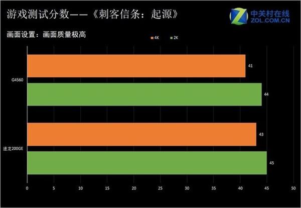 最后的《刺客信条:起源》这款游戏时我们可以看到速龙200GE实现了反超,在2K表现和4K表现均要强一些,整体差距依然不大,这是因为《刺客信条:起源》这款游戏有很多复杂多变的大场景,很考验CPU的多核心渲染能力,速龙200GE的实战渲染能力确实非常出色。