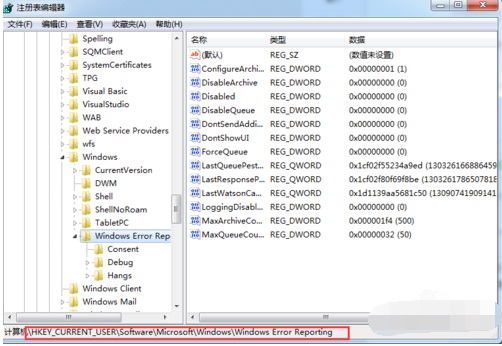 3,依次展开:HKEY_CURRENT_USERSoftwareMicrosoftWindowsWindows Error Reporting