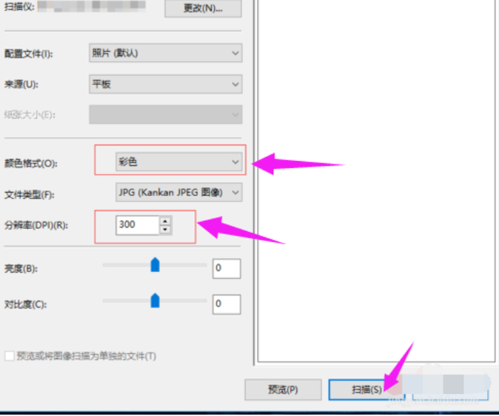 5,在弹出的窗口,我们可以选择扫描件的分辨率和颜色格式,设置好后,点击扫描,