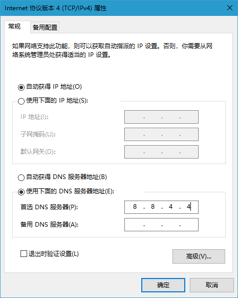 3。在“属性”窗口中,将首选DNS服务器地址设置为8.8.4.4,然后单击“确定”。