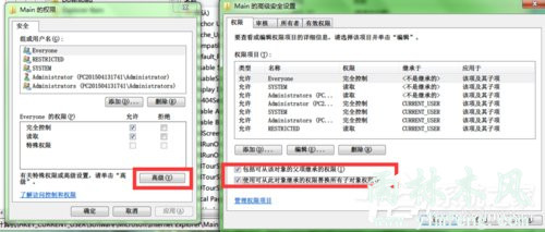 3、弹出窗口中,勾选完全控制权限,并点击高级按钮,勾选“包括可从该对象的父项继承权限”和“使用可从此对象继承的权限替换所有子对象权限”