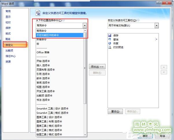 4、打开的对话框中,在左侧的菜单栏中点击“自定义”。在自定义菜单选项下,设置“从下列位置选择命令”为“不在功能区中的命令”。