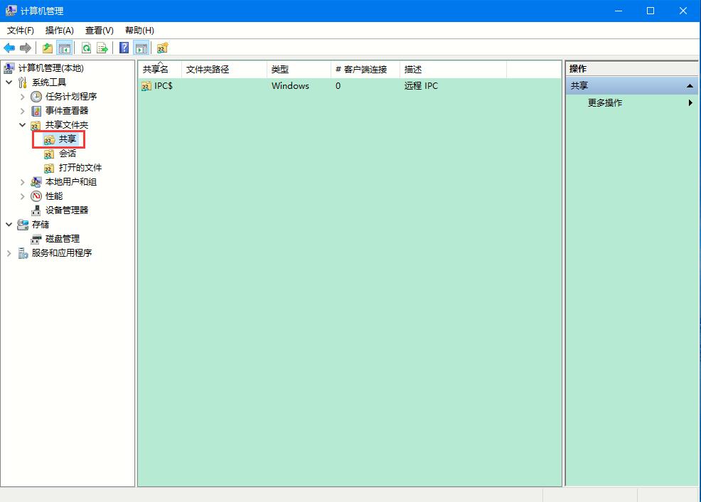 3、接下来我们在展开的菜单中点击“共享”菜单项,然后在右侧窗口中就可以查看到所有的共享的文件或文件夹了。