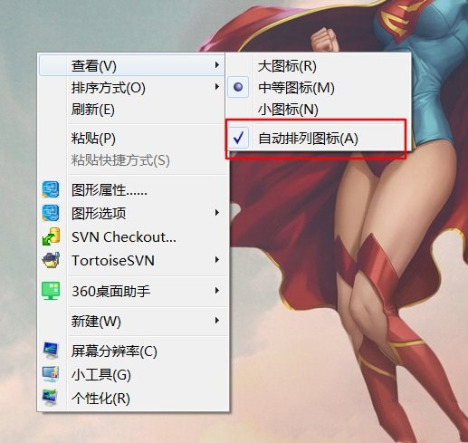 桌面右键--》查看--》选中【自动排列图标】。