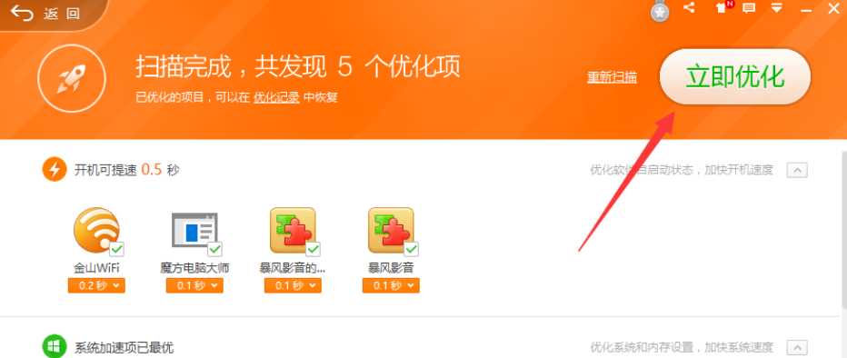 扫描完成后完成后,检查要优化的项目,然后单击Optimize按钮完成内存释放,启动加速,网络优化等功能。