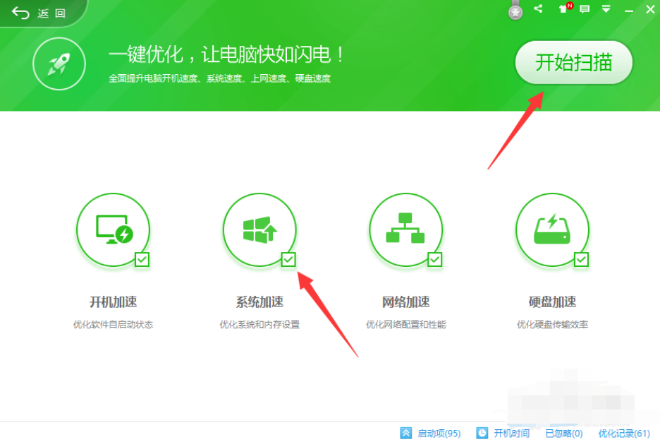 打开360 Security Guard - Optimize Accelerator主界面,确保检查系统加速项,单击立即扫描按钮。