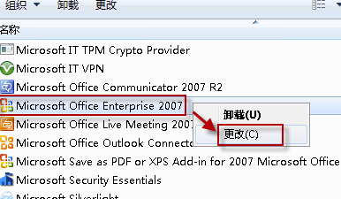 5、右击 Microsoft Office 2007/2010,选择“更改”。