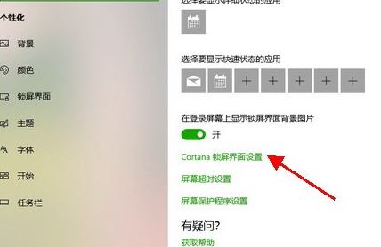 第三步、在个性化窗口,在左侧点击切换到“锁屏界面”选项卡,在右侧窗口找到并点击“Cortana锁屏界面设置”,如下图所示: