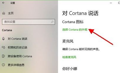第四步、在Cortana窗口,对Cortana说话选项卡下,在右侧窗口找到并点击“选择Cortana的外观”,如图所示: