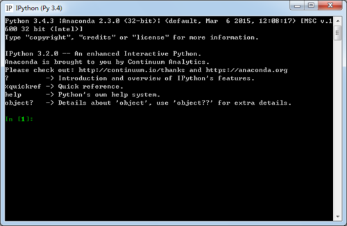 4、在这里有Anaconda管理器(Anaconda Command Prompt),IPython Notebook,IPython QT,IPython,Spyder。点击IPython,就进入了IPython的界面。