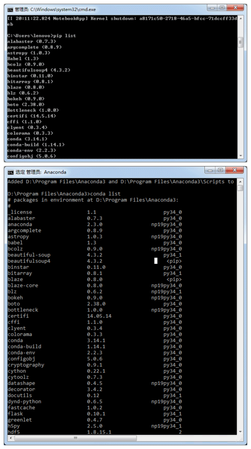 5、到此为止,IPython就算安装成功了,之后,我们可以在命令行(也就是cmd)中输入pip list或者在Anaconda管理器中输入conda list来查看已经安装的库。