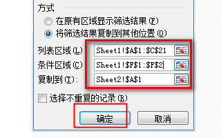 5、在高级筛选的小窗口中选择列表区域、条件区域和复制到的位置,再点击确定按钮即可。