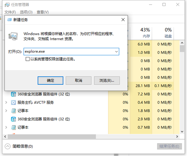 3、然后在弹出窗口,运行任务窗口中输入“explorer.exe”,最后点击“确定”。稍等片刻,电脑桌面会重新恢复正常。