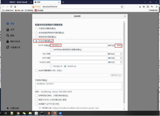 6、这时候计算机上的火狐浏览器也设置为了代理模式。代理设置成功之后,访问网页是访问不了的,因为我们没有将请求转发,接下来就需要配置burp来转发浏览器的请求。,配置burp在监听的端口设置与代理的端口相同