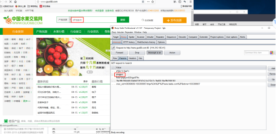 10、改包,比如水果网http://www.guo68.com/搜索水果:pingguo(搜索中文的时候抓的包是乱码,不利观察)一直点击forward,并且查看params选项,直到参数的内容中出现pingguo