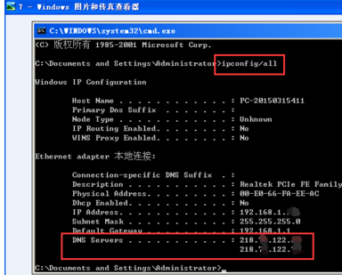 查询DNS地址也一样,开始运行输入cmd回车,光标后面输入ipconfig/all就可以查到电脑的DNS服务器地址