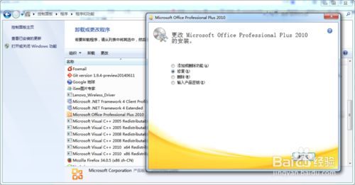 修复office 2010安装(控制面板-添加删除程序里面,选择“修复”安装)