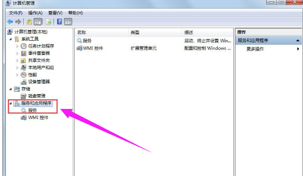 在打开的计算机管理界面依次点击服务和应用程序,点击:服务
