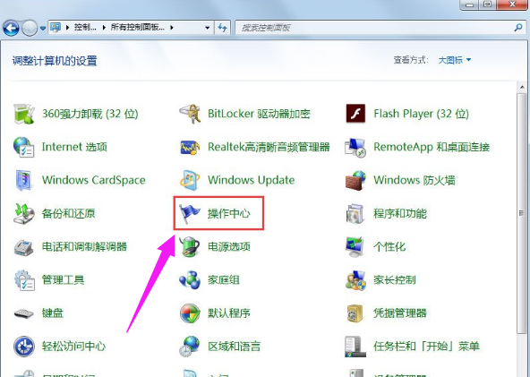 在控制面板界面找到操作中心选项