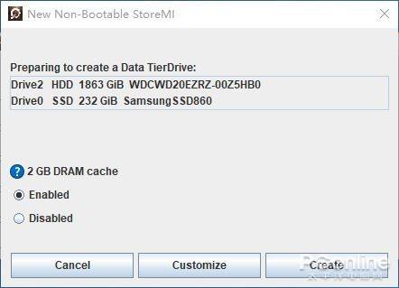 然后它会询问用户,软件可否划分2GB的内存作为融合后硬盘的加速缓存,为了测试AMD StoreMI技术是否真的有用,我们在这里选择可以。