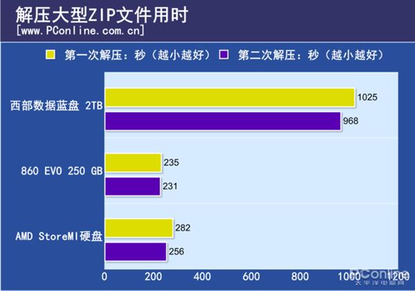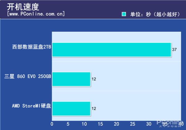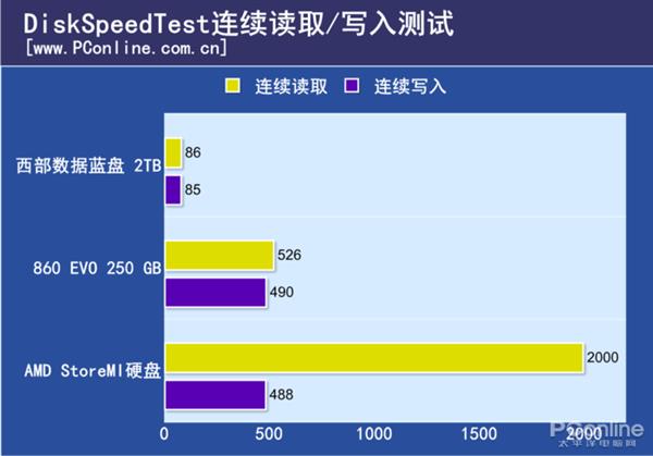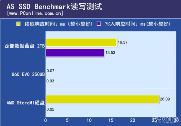 性能测试为了让测试的结果更加直观,我们也分别测试了860 EVO 256GB和西部数据蓝盘 2TB的读写和实际应用成绩,然后我们把860 EVO、西部数据蓝盘和AMD StoreMI硬盘的成绩汇总一起,就能很直观的看出这项技术有没有用。