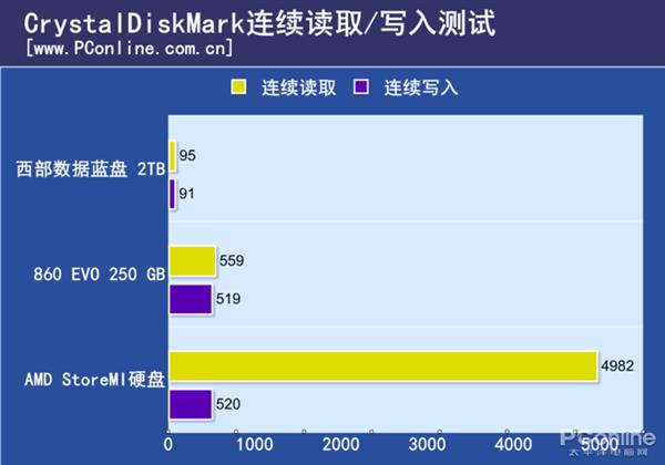 测试小结:AMD StoreMI技术对于存储届确实是新物种,在传统的硬盘读写测试中我们可以看到AMD StoreMI硬盘在多项测试中出现了不正常的成绩,我们逐一分析。