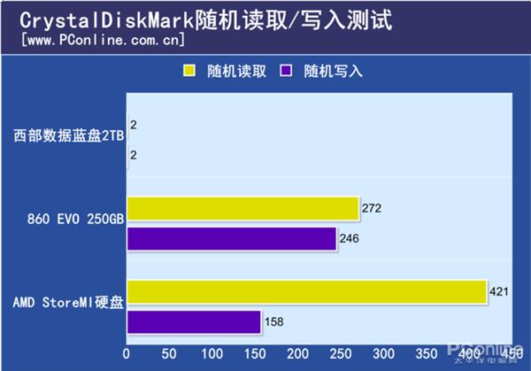 在连续读写成绩上,AMD StoreMI硬盘的读取成绩高的惊人,大家可还记得,我们在使用AMD StoreMI创建新硬盘时,划分了2GB内存作为新硬盘的高速缓存,再根据这读取速度,我们猜测此时软件读取的是内存上的数据测出来的速度。