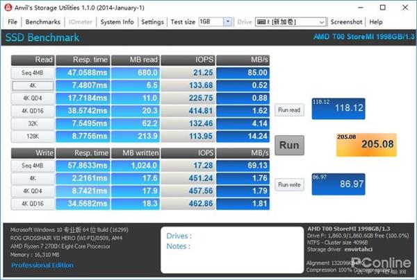 测试小结:Anvil`s Storage Utilities能十分全面的看出一个硬盘的性能,在这里AMD StoreMI的读取性能依然十分出色,写入性能稍逊于三星860 EVO。