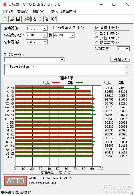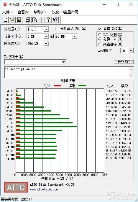 ATTO Disk Benchmark是一款简单易用的磁盘传输速率检测软件,可以用来检测硬盘,U盘, 存储卡及其它可移动磁盘的读取及写入速率。它可以监测到存储设备对于各种大小零碎文件的读写速度,比如4KB的成绩就是读写许多个4KB大小,总计256MB大小文件夹的速度。